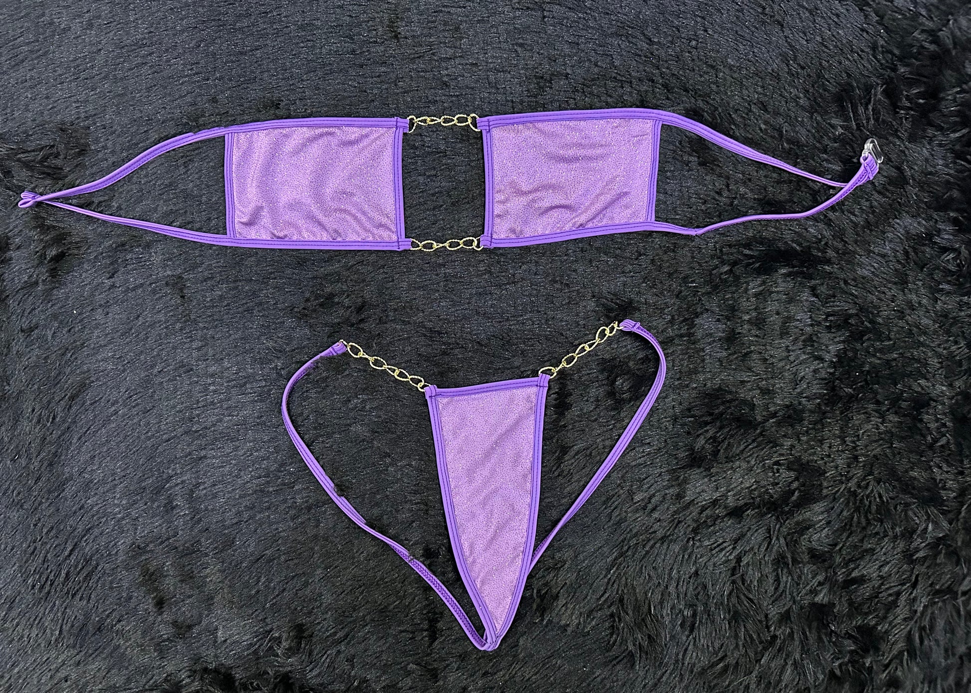 Own every curve and command every glance in this electrifying purple bikini. Designed to turn heads, the top features a sultry center cut-out connected by luxe gold chain links, perfectly balancing glam and edge. The matching micro thong completes the look with sleek chain sides and a glittery finish that catches the light from every angle. Whether for poolside posing or private nights in, this set is made for the bold.
