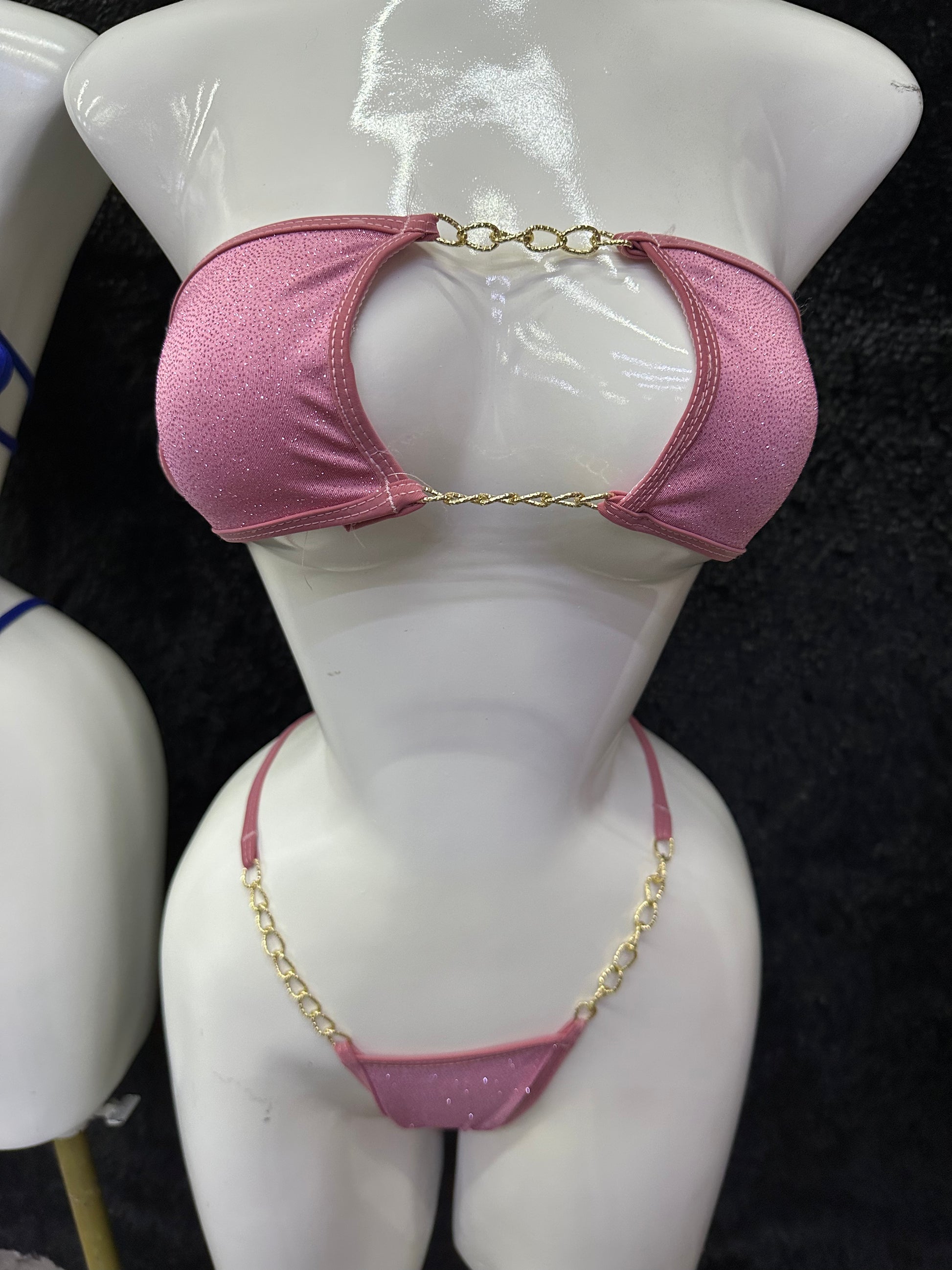 Own every curve and command every glance in this electrifying purple bikini. Designed to turn heads, the top features a sultry center cut-out connected by luxe gold chain links, perfectly balancing glam and edge. The matching micro thong completes the look with sleek chain sides and a glittery finish that catches the light from every angle. Whether for poolside posing or private nights in, this set is made for the bold.